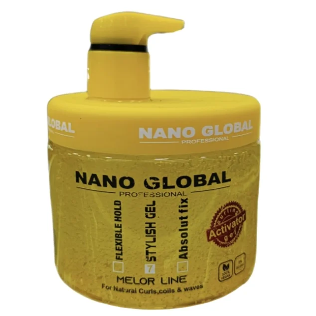 پک 4تایی محصولات نانوگلوبال زرد شامل شامپو، ماسک داخل حمام، کرم بعد حمام و ژل است که برای تقویت و مراقبت از موی فر و مجعد طراحی شده اند.